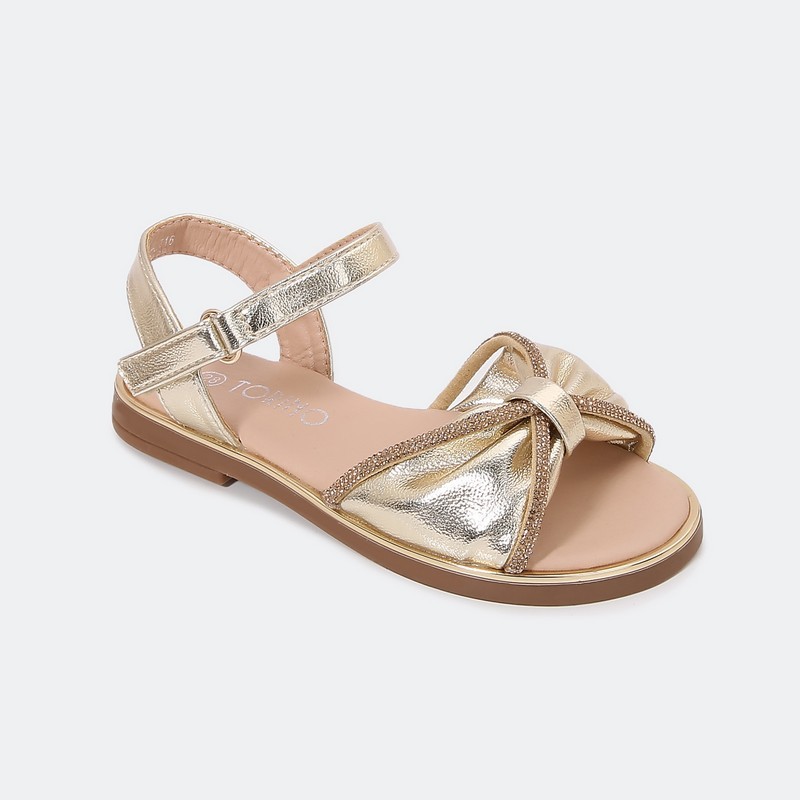 دعوا إطلالة فتاتكم تكتمل مع هذا الصندل , ذو مقدمة بتصميم فيونكة مزينة بالستراس , حزام لاصق للإغلاق . مناسب لكافة الأوقات
