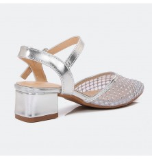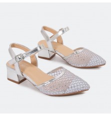 يُعد هذا الصندل خيار مثالي لطفلتك، تصميم أنيق ذو خامة مميزة بمقدمة من التول المرصع بالستراس، ذو كعب 3سم ومقدمة مدببة متوفر باللونين الأبيض والفضي