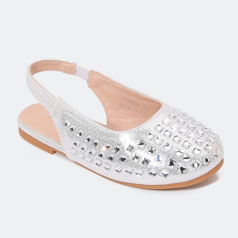 سيصبح هذا الصندل المفضل لطفلتك, ذو مقدمة مغلقة مستديرة بخامة من الجلد الصناعي اللامع المزين بالستراس, متوفر باللونين الفضي والذهبي