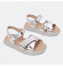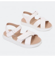 يعتبر هذا الصندل مناسب لإطلالة طفلتك اليومية، ذو تصميم أنيق وعملي، مصنوع من الجلد الصناعي اللامع مع حزام كاحل وابزيم أمامي للإغلاق، ألوان كلاسيكية