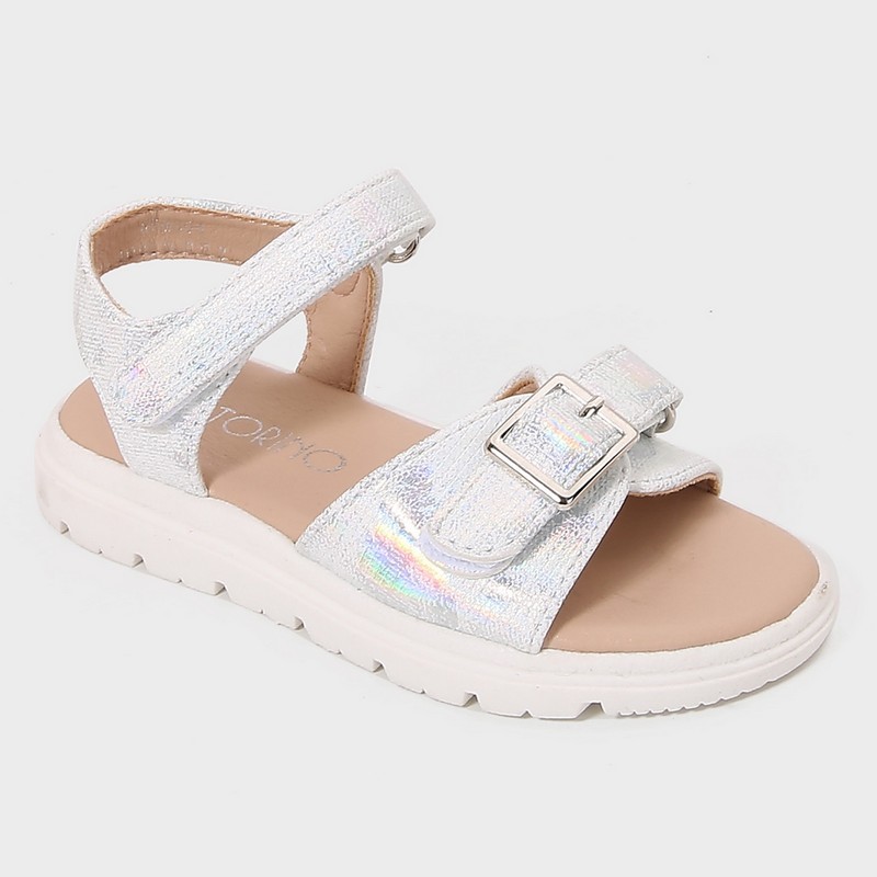 صندل بناتي مسطح مصمم من الجلد المموج بطريقه عصريه ومميزه، مع حزام لاصق للإغلاق وحزام في المقدمة مدعم لراحة طفلتك، تسوقيه الان من تورينو