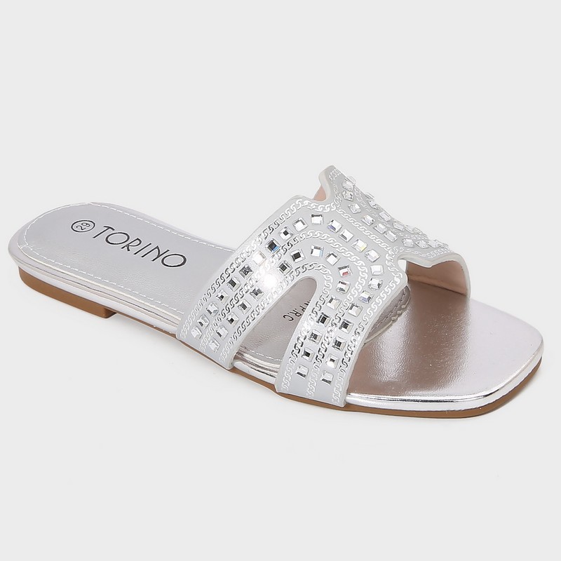نقدم لكم نعال مسطح ذو تصميم جذاب بمقدمة مفتوحة مربعة مزين بحبات الستراس بشكل مميز , مريح ومناسب لكافة الأوقات