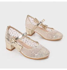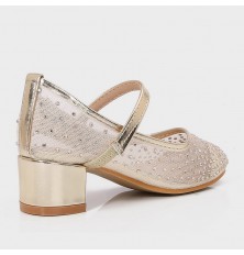 حذاء كعب 5 سم ذو مقدمة مستديرة، خامة من التول المزين بالستراس, مع ابزيم أمامي مزينبفيونكا جانبية، تنسيقه مع إطلالات مختلفة، اختاريه لإطلالة طفلتك