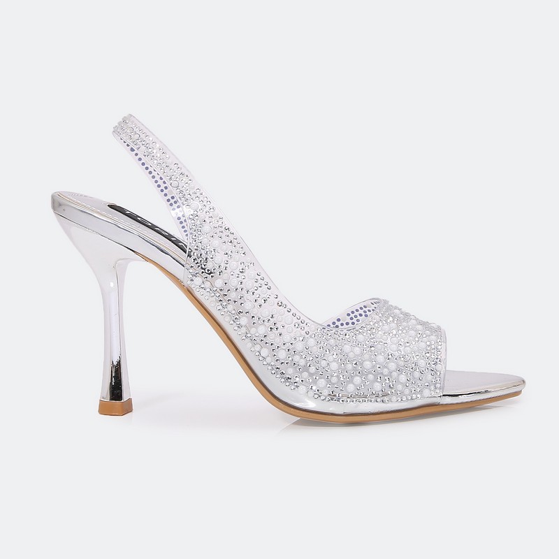 تألقي مع هذا الصندل من تورينو بكعب 9 سم لامع، مقدمة مدببة شفافة مرصعة بالستراس، يمكن تنسيقه مع خيارات مختلفة