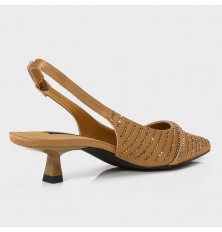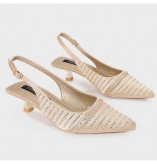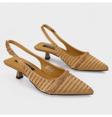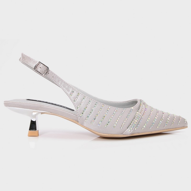 نقدم لكِ هذا الصندل من تورينو , ذو كعب قصير 2سم، مقدمة مدببة بخامة من الساتان المزين بالستراس، مع حزام كاحل للإغلاق، مناسب لكافة الأوقات