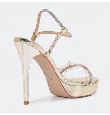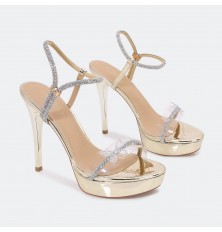 تألقي مع هذا الصندل، ذو مقدمة مفتوحة وكعب 12سم , تصميم فخم بجزء شفاف مزين بحبل من الكريستال مع فراشة، إبزيم امامي وخلفي، مناسب للسهرات