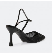 تألقي مع هذا الصندل بكعب 7 سم , تصميم فخم بجزء من التول المزين بالستراس اللامع ، مناسب لكافة الأوقات
