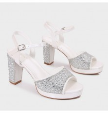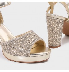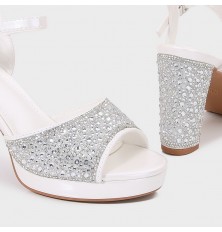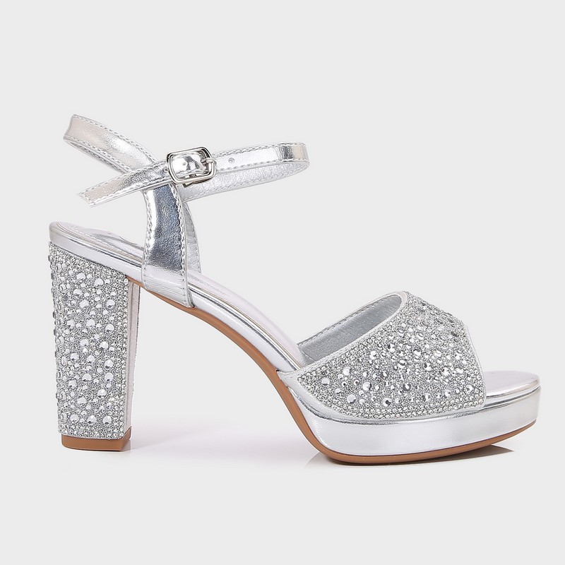 صندل كعب عريض وفخم 9سم, لامع و أنيق، ذو مقدمة مستديرة مرصعة بالستراس ، مناسب للحفلات