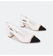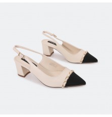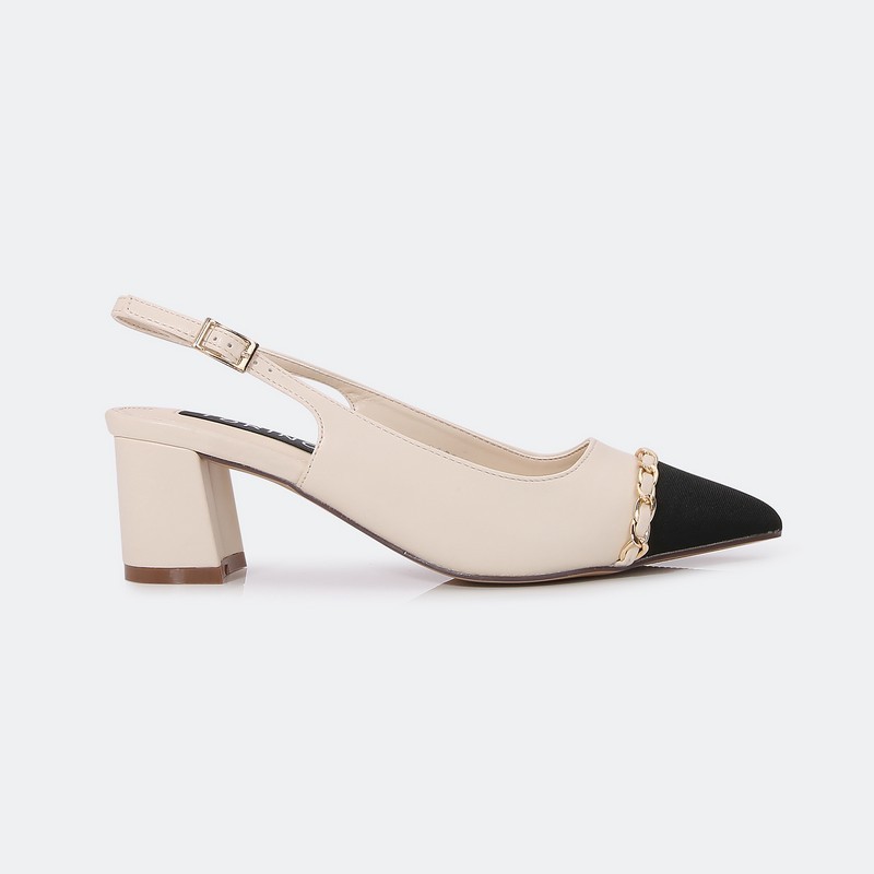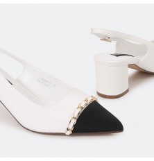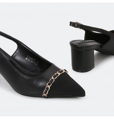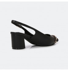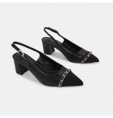 سيصبح هذا الصندل المفضل لديكِ , ذو كعب 4 سم وتصميم عصري بمقدمة مغلقة , مزين بسلسلة ذهبية اللون , مريح ومناسب للإستخدام اليومي