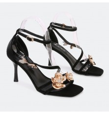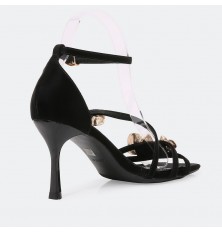 سيصبح هذا الصندل بكعب 7 سم المفضل لديكِ , تصميم فخم ومميز مزين بتفاصيل معدنية باللون الذهبي و الستراس , حزام كاحل و إبزيم للإغلاق , مناسب للحفلات