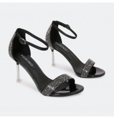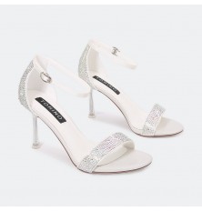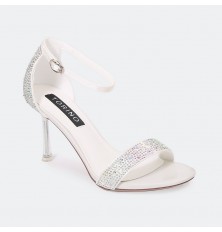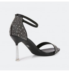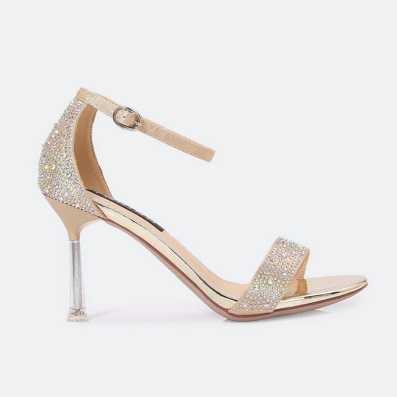 أضيفي الأناقة لإطلالتك مع هذا الصندل المزين بالستراس , بكعب 7 سم رفيع شفاف , مغلق من الخلف مع حزام حول الكاحل