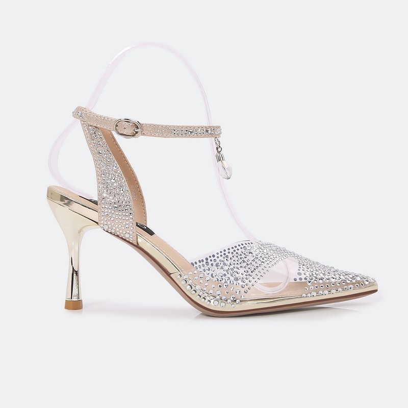 ستكتمل إطلالتك مع هذا الصندل من تورينو , بكعب 7 سم وتصميم فخم شفاف مزين بالستراس , حزام كاحل و إبزيم للإغلاق