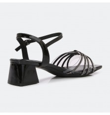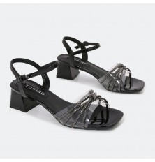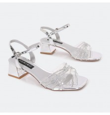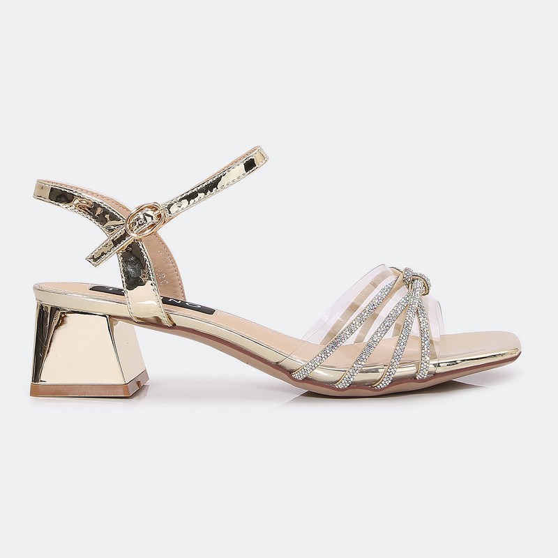 يجمع هذا الصندل بين الأناقة و الراحة , ذو كعب 4 سم وتصميم لافت بجزء شفاف مزين بالكريستال .حزام كاحل و إبزيم للإغلاق