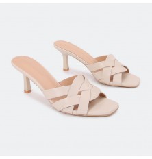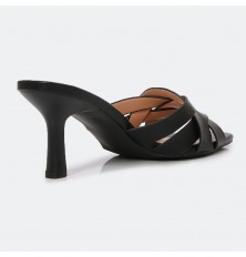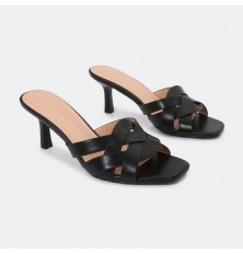 نعال بتصميم عملي ومريح وانيق من الجلد على شكل شرائط متداخلة وكعب 7سم بمقدمة مربعة، ألوان كلاسيكة، يمكن تنسيقه مع خيارات مختلفة
