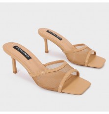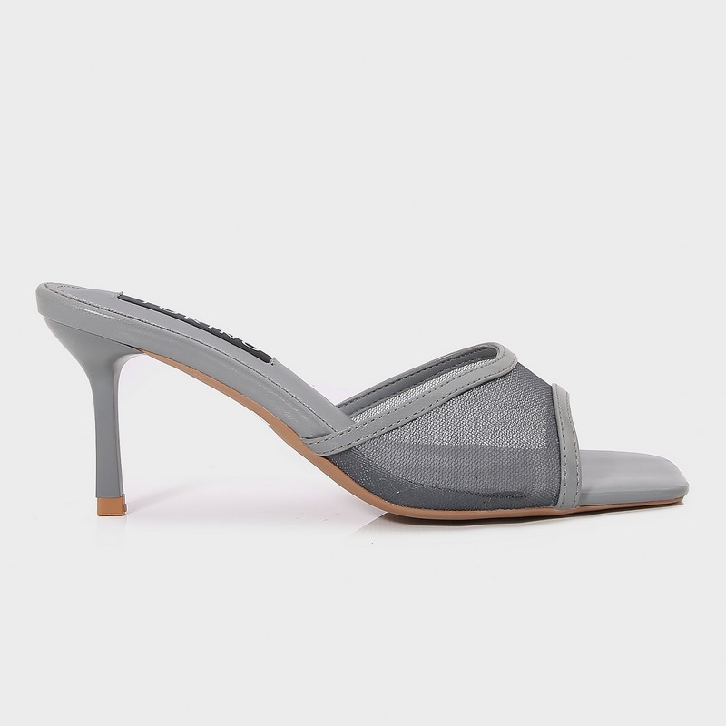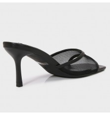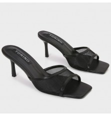 تألقي مع هذا النعال بكعب 7 سم، تصميم أنيق ذو مقدمة مربعة بجزء من التول, متوفر بألوان مناسبة لكافة الأوقات