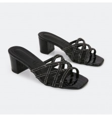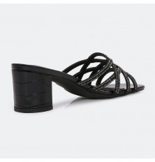 نقدم لكِ هذا النعال من تورينو، ذو كعب عريض 5 سم، تصميم عصري مزين بالستراس، يمكن تنسيقه مع إطلالات مختلفة