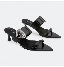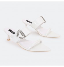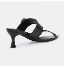 نقدم لكِ نعال كعب 4 سم من الجلد الصناعي اللامع, تصميم لافت مزين ببروش ، ومتوفر بألوان أنيقة