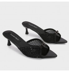 تألقي مع هذا النعال من تورينو , بكعب 5 سم ذو تصميم فخم من التول المزين بالستراس، متوفر بألوان يمكن تنسيقه مع خيارات مختلفة