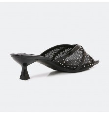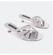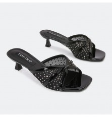 تألقي مع هذا الكعب 4 سم , تصميم لامع ذو مقدمة مربعة بجزء من التول مزين بالستراس , مناسب للأوقات المسائية