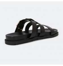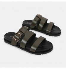 نعال مسطح مريح وعملي، ذو تصميم ناعم بثلاثة أحزمة مزين بقفل، مناسب للإستخدام اليومي
