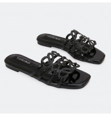 يقدم لك متجر تورينو نعال مسطح، بتصميم هندسي مميز وأنيق، ذو مقدمة مربعة من الجلد الصناعي اللامع