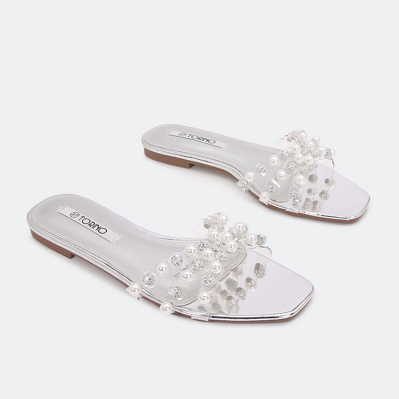 نعال تورينو شفاف مزين بحبات اللؤلؤ وكرات براقة يضفي لمسات استثنائية من التميز والفخامة على إطلالتك في أي مكان تكونين به. تفضلي بالاطلاع على تشكيلتنا واختاري حذاءك المفضل.