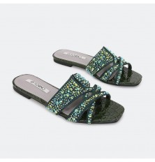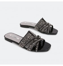 نعال تورينو مسطح بقاعدة جلدية وشرائط مرصعة بالستراس