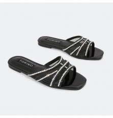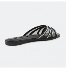 نقدم لكِ نعال مسطح نسائي أنيق من الجلد الصناعي اللامع وبجزء من التول مزين بالستراس