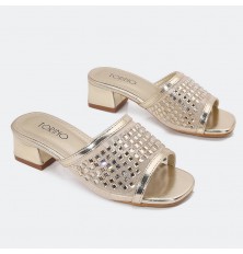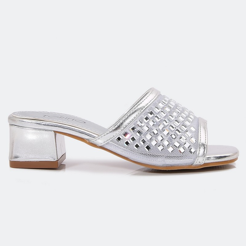 5 cm square toe heel slippers, and a tulle front decorated with strasses, with an elegant design that can be coordinated with different looks, choose the best for your child