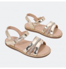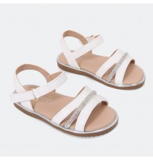 We offer you these sandals with a practical, comfortable and elegant design in shiny leather decorated with crystal cord with front strap closure, available in indispensable colors, get it for your child's elegant look