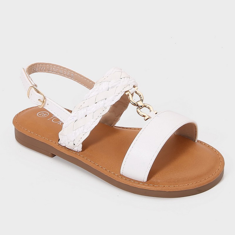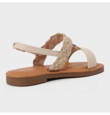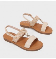 Flat girls sandals, with leather and braided part with two loops, with ankle strap closure, can be coordinated with different options