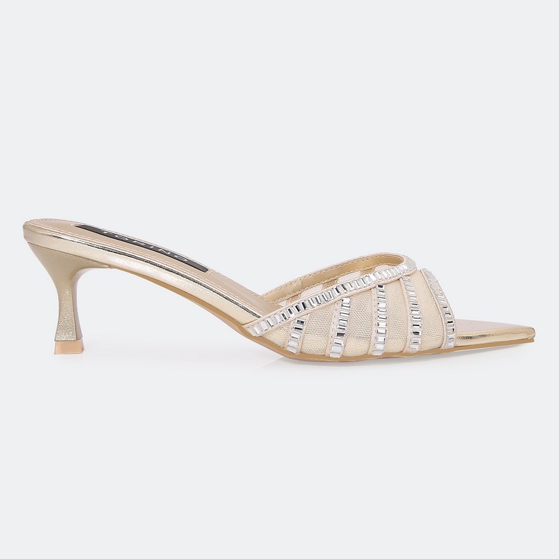 5 cm heel slippers feaTorinog an elegant design made of tulle embellished with strass can be styled with various looks.