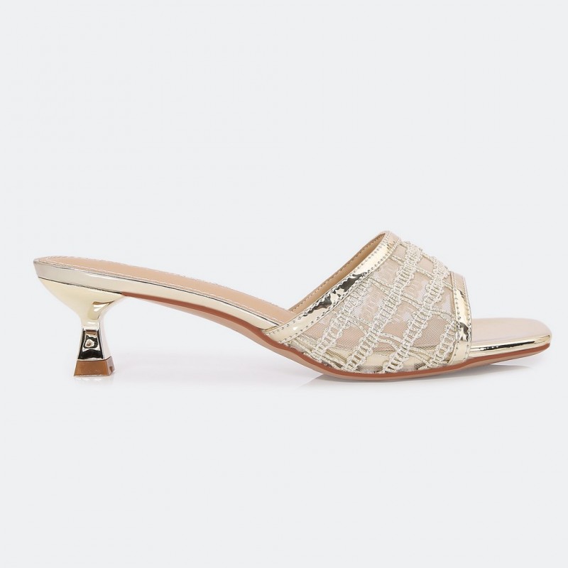 Shine with these 3 cm heeled sandals, feaTorinog a luxurious design with an embroidered tulle part, suitable for daily use.