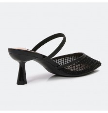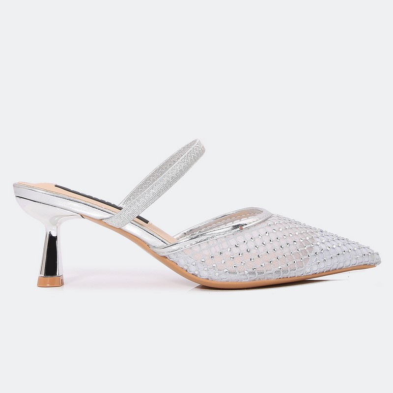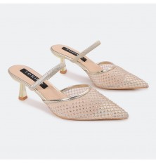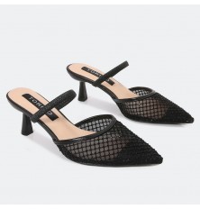 We offer you these slippers from Turin, with a heel of 5 cm, a luxurious design Closed pointed toe with a part of tulle decorated with strass, with a buckle supported by shiny crystals, suitable for all times