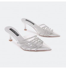 We offer you 5 cm heel slippers , trend design and transparent decorated with crystals, it can be coordinated with different looks