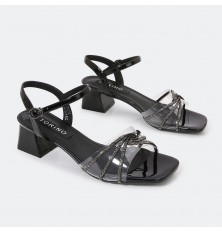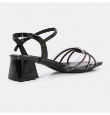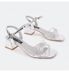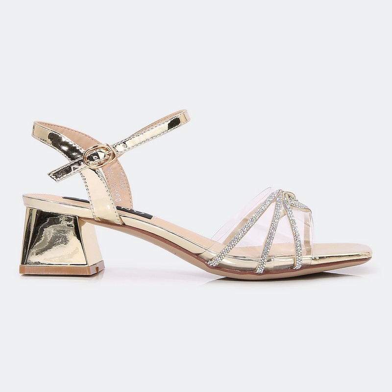 These sandals combine elegance and comfort , with a 4 cm heel and a striking design with a transparent part decorated with crystals .Ankle strap and buckle for closure