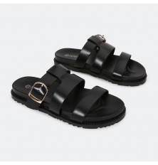 Comfortable and practical flat slippers with a soft design feaTorinog three straps adorned with a buckle, suitable for daily use.