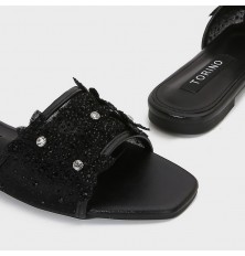 We present to you these slippers from Torino, featuring a distinctive design adorned with tulle flowers studded withstrass, available in colors that can be coordinated with various outfits.