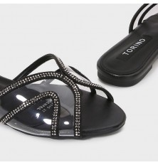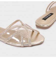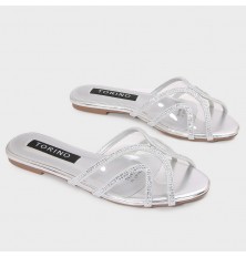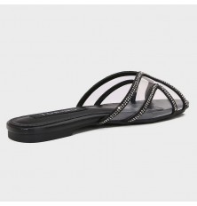 Flat slippers with a modern design, a transparent rounded front decorated with strass, easy to wear, and can be coordinated with different looks.